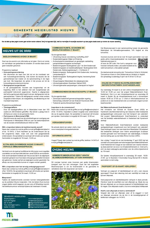 meierijstad.nieuws.nl van de bekendmakingen van de gemeente Meierijstad met betrekking tot vergunningen en procedures. Wekelijks verschijnt de informatiepagina op deze nieuwssite.