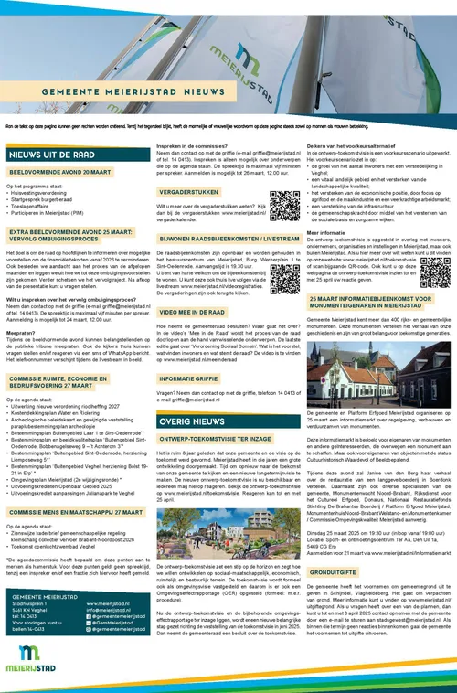 meierijstad.nieuws.nl van de bekendmakingen van de gemeente Meierijstad met betrekking tot vergunningen en procedures. Wekelijks verschijnt de informatiepagina op deze nieuwssite.