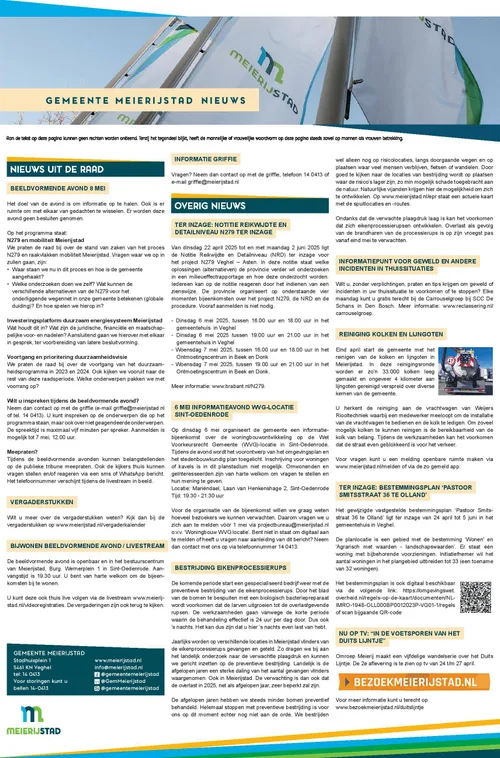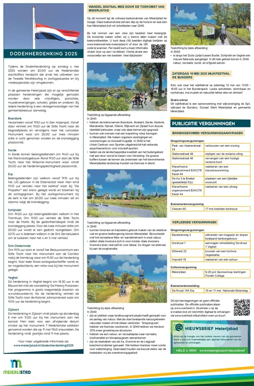 Blijf op de hoogte via meierijstad.nieuws.nl van de bekendmakingen van de gemeente Meierijstad met betrekking tot vergunningen en procedures. Wekelijks verschijnt de informatiepagina op deze nieuwssite.