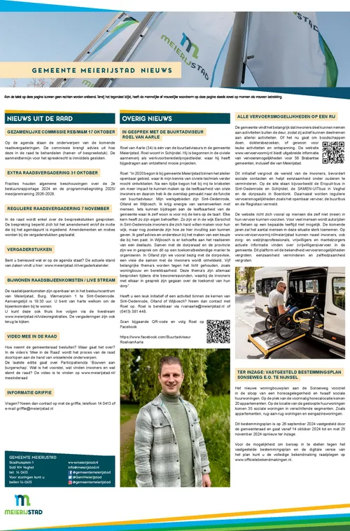 Blijf op de hoogte via meierijstad.nieuws.nl van de bekendmakingen van de gemeente Meierijstad met betrekking tot nieuws, vergunningen en procedures. Wekelijks verschijnt de informatiepagina op deze nieuwssite.