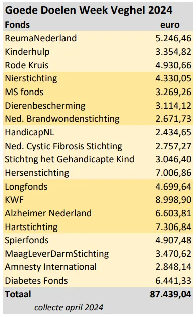 De taakgroep Financiën heeft de verwerking van alle collecte-formulieren verzorgd. Ook dit jaar is er een duidelijke stijging bij het online doneren. Het gemakkelijke doneren via de QR-code is populair in Veghel. "Natuurlijk willen wij de inwoners van Veghel, alle vrijwilligers, betrokken organisaties en sponsoren heel hartelijk danken. Door uw steun kunnen de fondsen weer veel van hun plannen en onderzoeken realiseren", aldus Iris Bogers van de Goede Doelen Week Veghel.