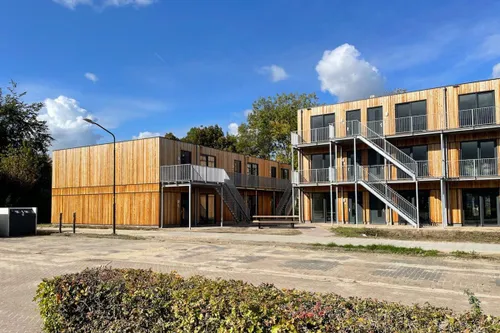 De houten appartementen en studio’s van ongeveer 49 tot 65 m² zijn bijna kant-en-klaar gebouwd in de woningfabriek van Barli in Uden. Hierdoor konden ze in één weekend op de locatie in Veghel geplaatst worden. De woningen blijven 15 jaar aan de Muntelaar staan waarna ze naar hun definitieve plek gaan. Jan van Vucht, directeur van Area, legt uit: “Met deze duurzame, snel te plaatsen woningen kunnen we beter inspelen op de vraag naar betaalbare huurwoningen in Veghel en omstreken. Samen met gemeente Meierijstad zetten we ons in om met dit soort woningen op korte termijn meer mensen van een woning te voorzien.”