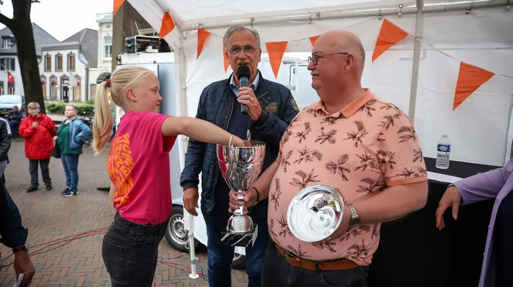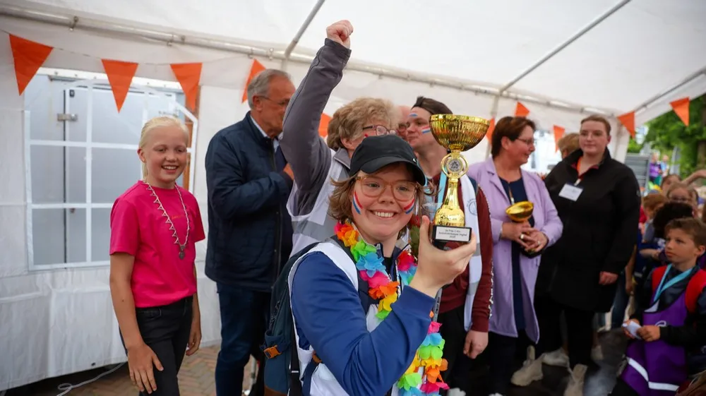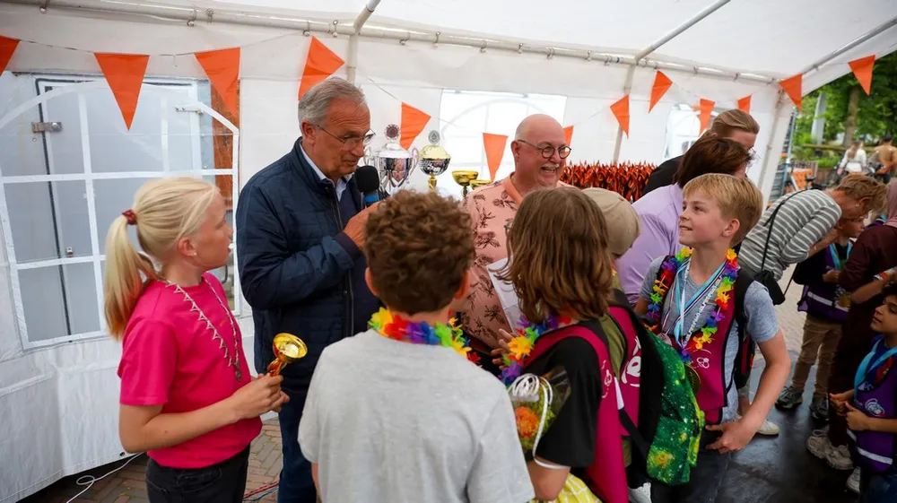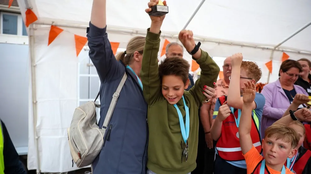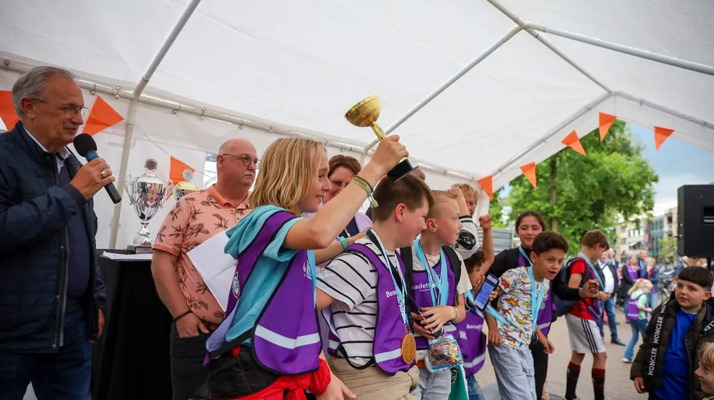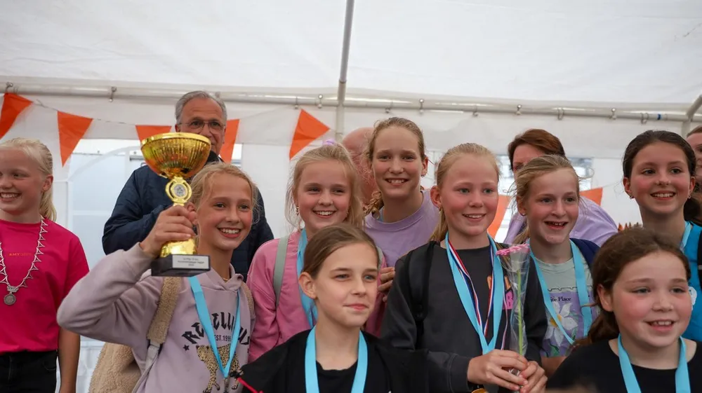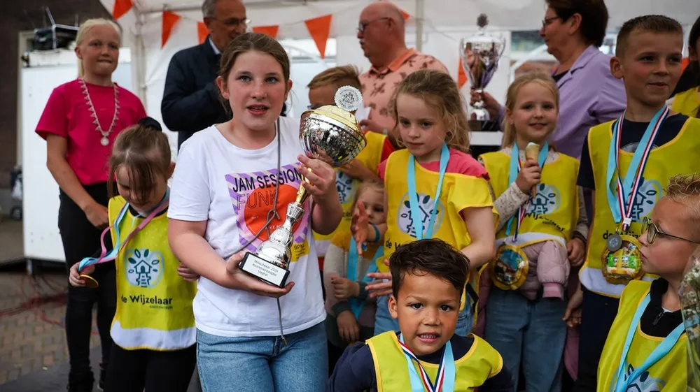 Kinderburgemeester Karlijn Koenen en wethouder Jan Goijaarts reikten de bekers uit. Hieronder de uitslag per afstand.