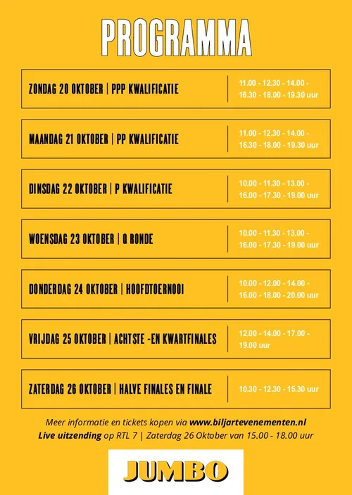 Bijzonder dit jaar is dat de finale van de World Cup Veghel, zaterdag 26 oktober 15:00-18:00, live wordt uitgezonden op RTL7. Het gebeurt niet vaak dat een driebanden finale op het openbare net te zien is – dus zet deze dag/tijd in uw agenda.